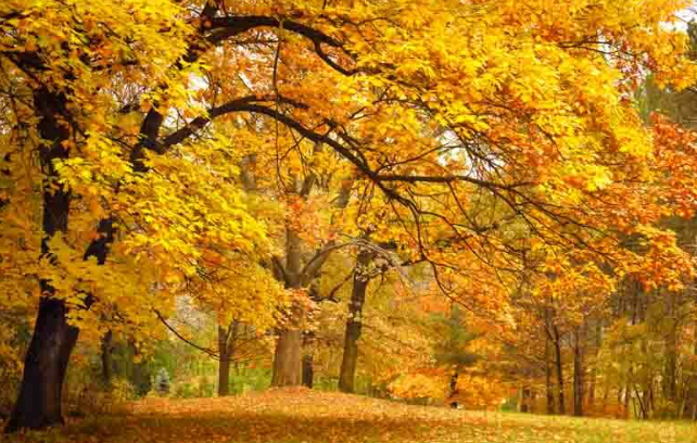Why Do Green Leaves Turn Red and Yellow in Fall? In fall, the green leaves on trees change color and turn red, yellow, and orange. This happens because the chlorophyll in the leaves starts to break down.